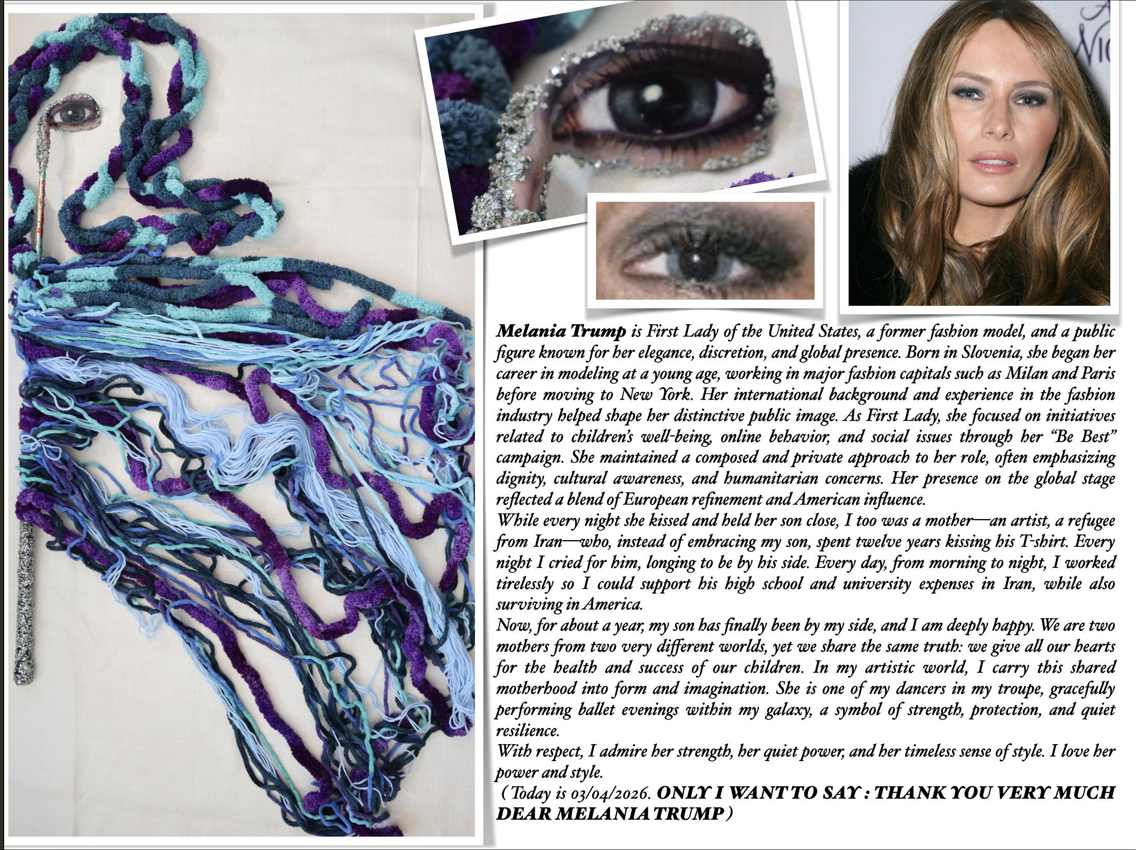 As a new citizen of the United States since 2022, I am inspired by the American Dream and committed to achieving my artistic aspirations while advocating for freedom and humanity. I am not aligned with any political group and believe deeply in the power of art to transcend cultural and religious boundaries. I haven't endorsed any political faction, and I won't and I have not and will not participate in any political rally or march. My support extends to all innocent individuals and children worldwide, irrespective of their religion they killed or suffered a lot. Above all, I believe and trust love, forgiveness, generosity, and humanity in our world. I hold deep respect for those who strive to create a more beautiful world for children, and I steadfastly believe in the freedom of all individuals on Earth, as I value freedom myself, and I have endured significant struggles to achieve freedom.
