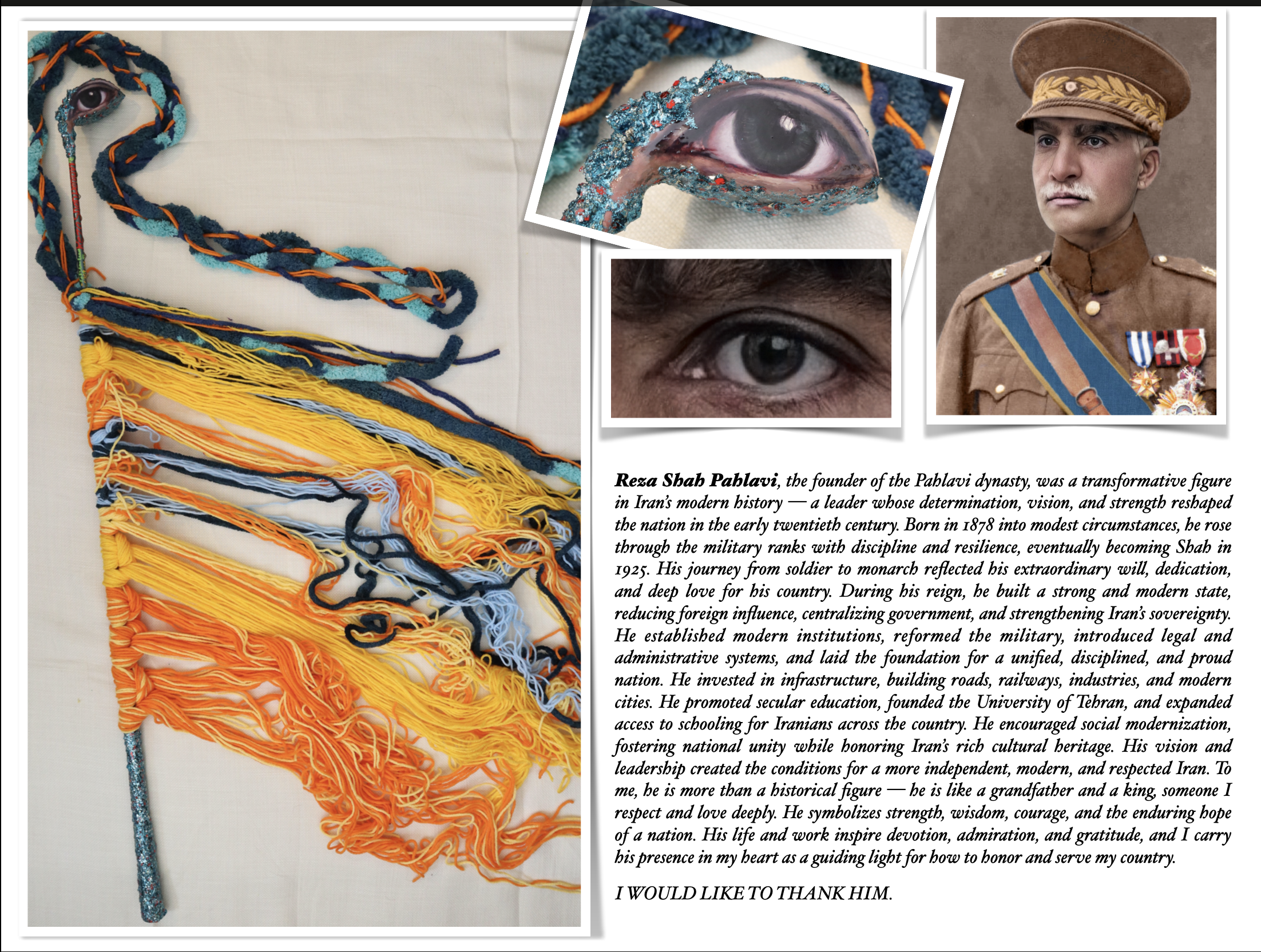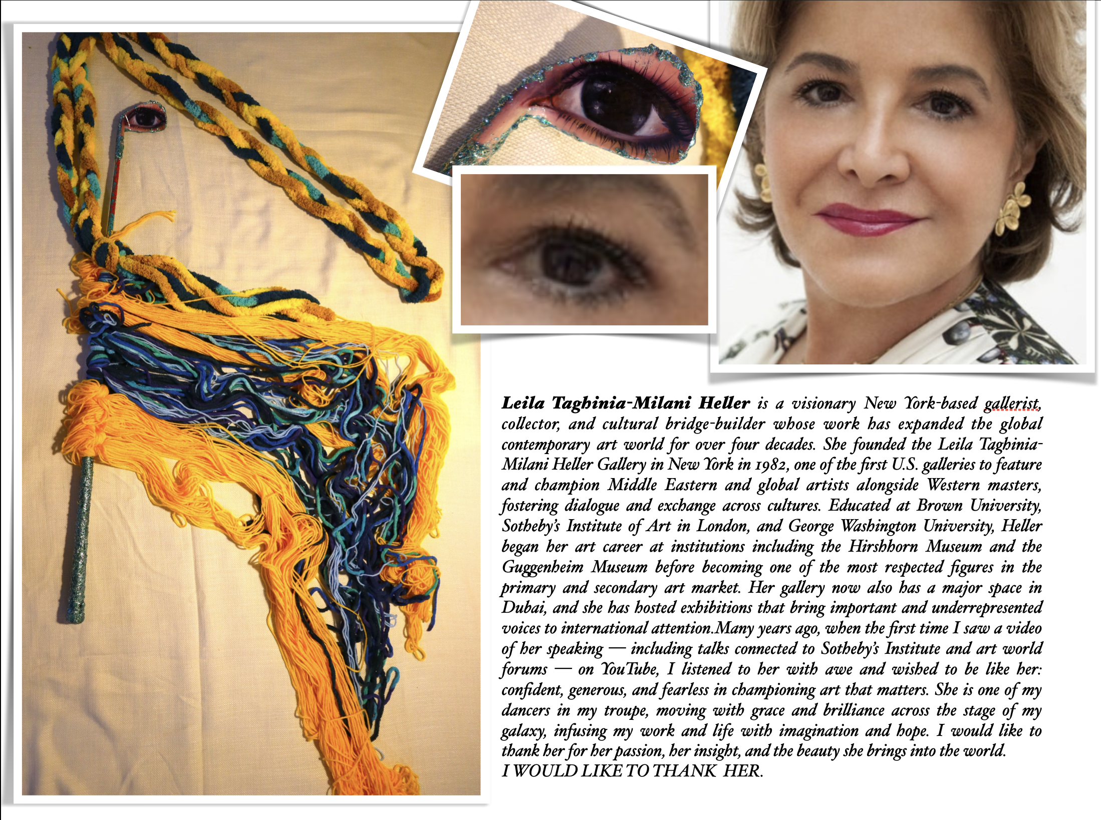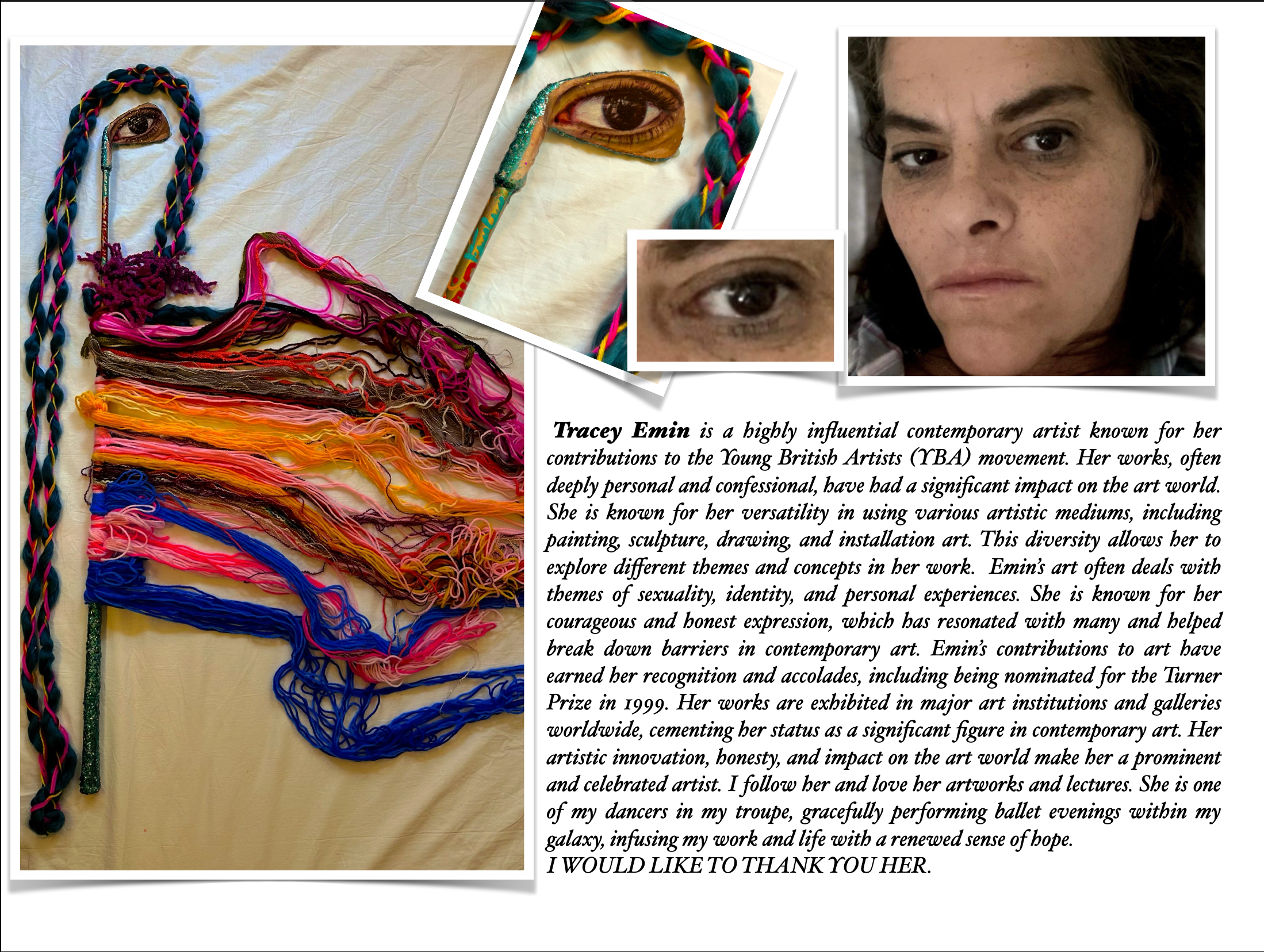 I washed them and for about a month, they were in my bedroom. Before sleep, I would gaze at them, wondering how to turn them into ballet dancers. I decided to paint an eye on the golf club heads and adorned the upper and lower parts of the golf club with glittering, shiny, and colorful particles. I’ve always had a fascination with shiny and sparkling things, a preference rooted in a childhood story, which I briefly explained in part 1, and why I use shiny materials in my artwork. I also used yarn for the decorations on the body and the golf club wood. My choice of yarn also relates directly to my childhood memories, which I elaborated on in part 2. These childhood memories have a profound and direct impact on my painting and artworks because I was born and raised in a small town in Iran, near the Afghan border. The people, customs, and challenging life of those villages during my childhood are unforgettable. I had only seven golfs to start with when I began crafting my ballet dancers who danced in my mind’s universe and filled me with happiness and wonder. My list of dancers grew day by day, and I eventually found a shop where I could purchase more golf clubs to continue my project. My list had no specific basis; it included individuals I wished I could meet and have dinner with someday, even if they were no longer alive that I admire, actors, artists, and successful and famous people whom I believe have had a positive impact on our planet. Also, I made a lot of statues of ballet dancers to honor those killed on September 11 in America and innocent people killed in different wars who were not famous but contributed to making the earth a more beautiful place. People like those who had passed away due to earthquakes in Turkey and Syria or due to conflicts in Ukraine or my own country, Iran. I would like to thank you to all of them. I worked on this project for about three years, and after my exhausting daily work, I would continue crafting my ballet dancers until midnight, adding to their numbers.